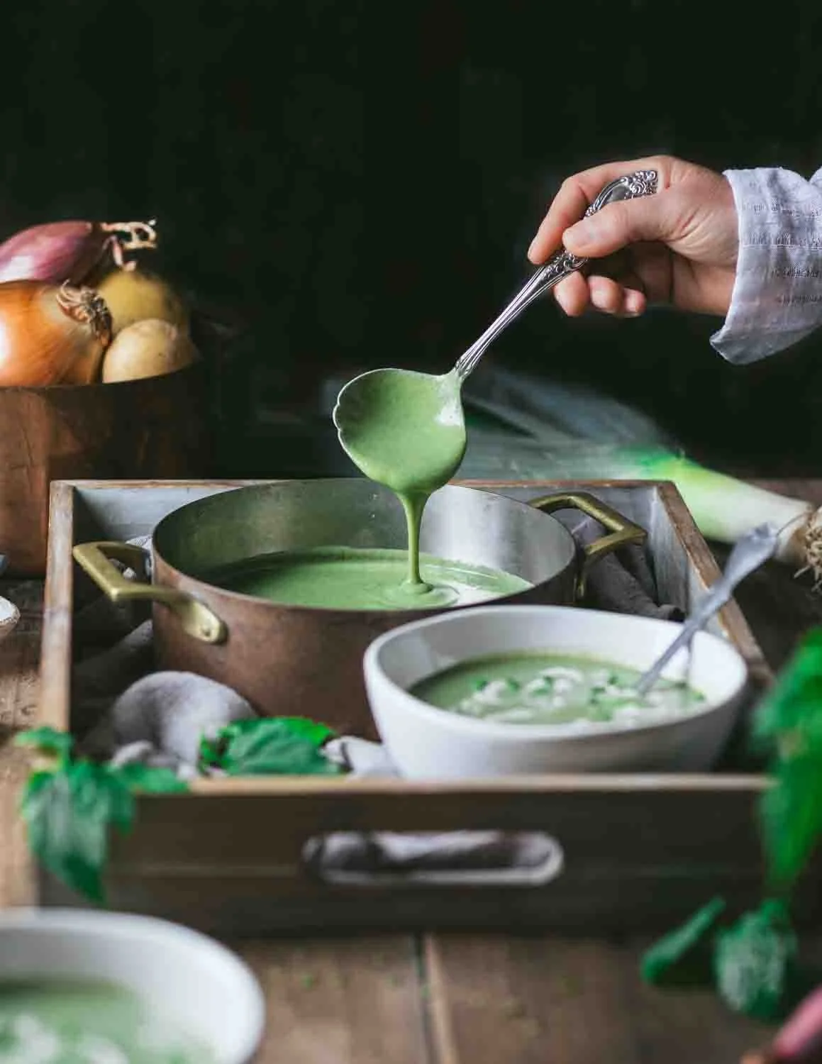 - Blanch the nettles- Use tongs to submerge the stinging nettles in the hot soup, making sure they are fully covered. Cook for 2 more minutes.