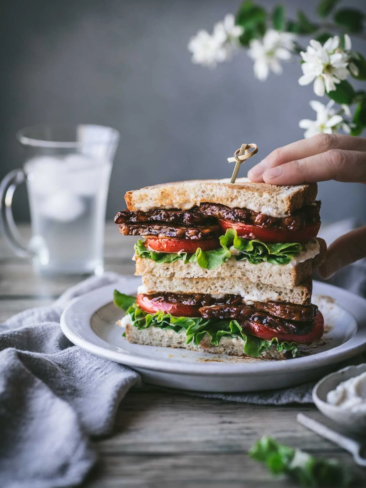 - Now add 4 tomato slices on top of the lettuce followed by a generous layer of tempeh bacon. Top each sandwich with a slice of bread, mayonnaise side down. Enjoy sliced in half or whole!