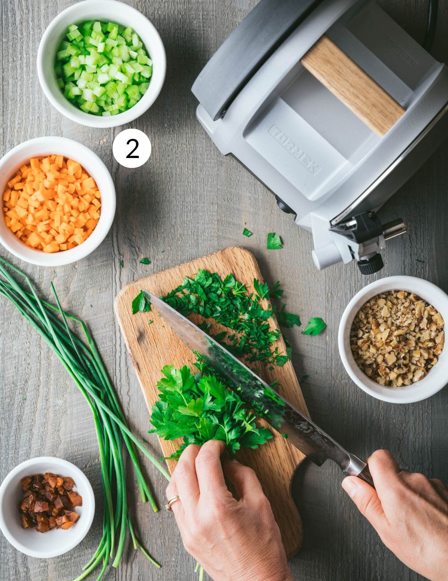 - Prepare the salad ingredients- While the couscous is cooling, chop the carrots, celery, walnuts, parsley, chives, and apricots.