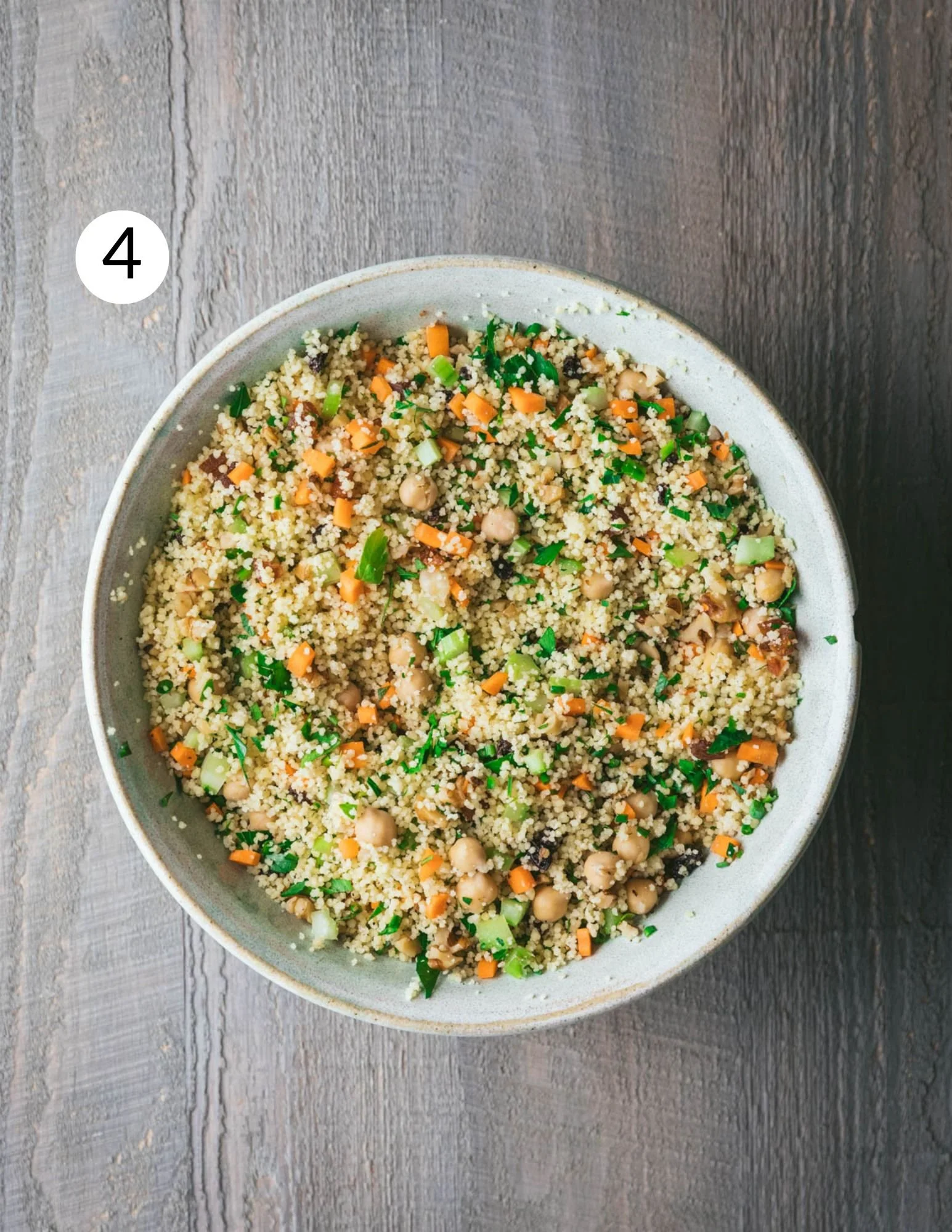 1.Cook the couscous- Bring the water to a boil in a medium (lidded) pot over high heat. Slide the pot off the heat and pour in the couscous, followed by the oil and salt. Stir until incorporated and cover the pot. After 5 minutes, check to see that the grains have absorbed all the liquid. Once absorbed, uncover, and fluff them up with a fork. Transfer the couscous to a salad bowl and set aside to cool.