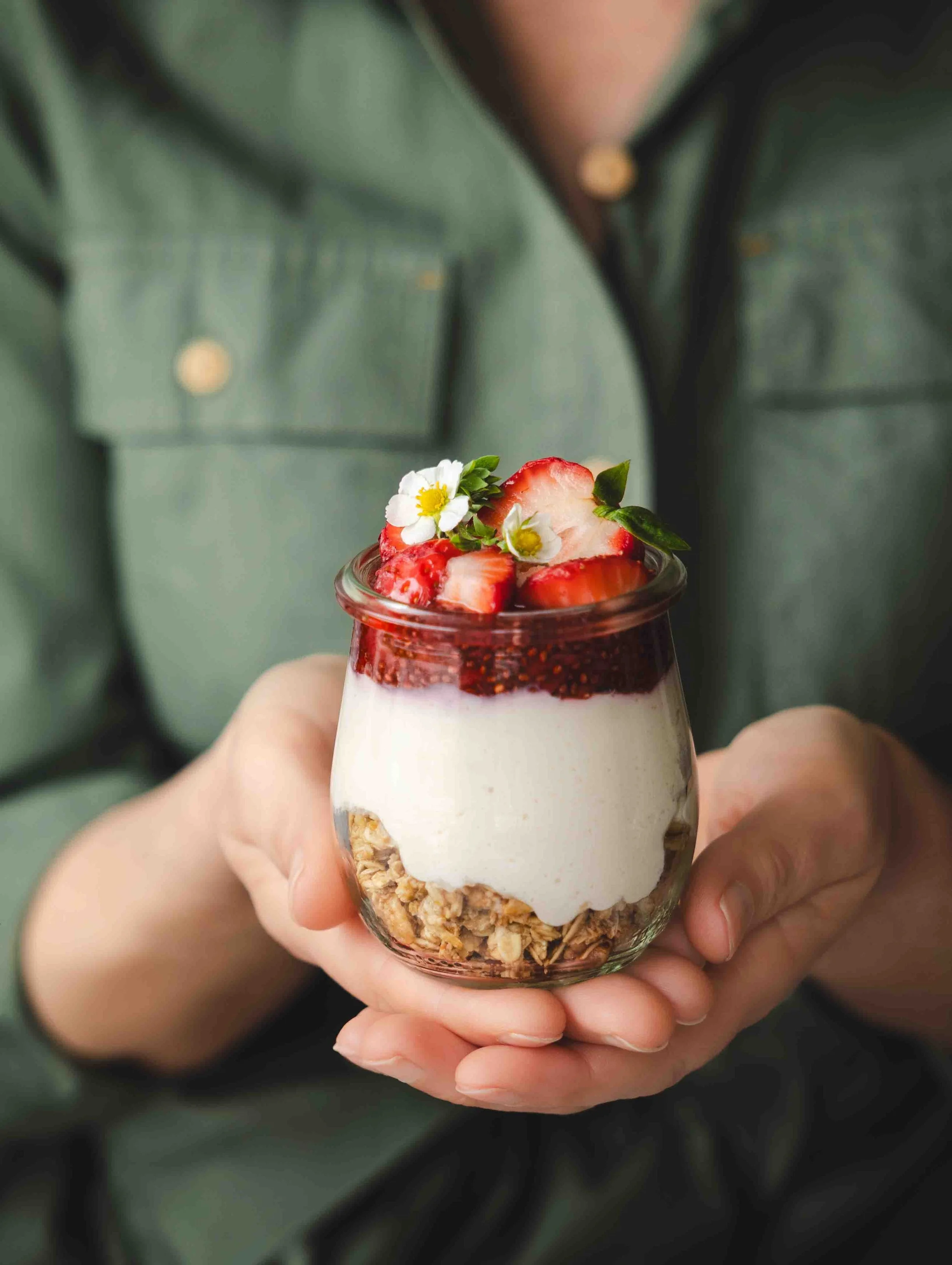 1️⃣ Make a vegan yogurt parfait layered with granola, chia jam, and topped with fresh fruit.