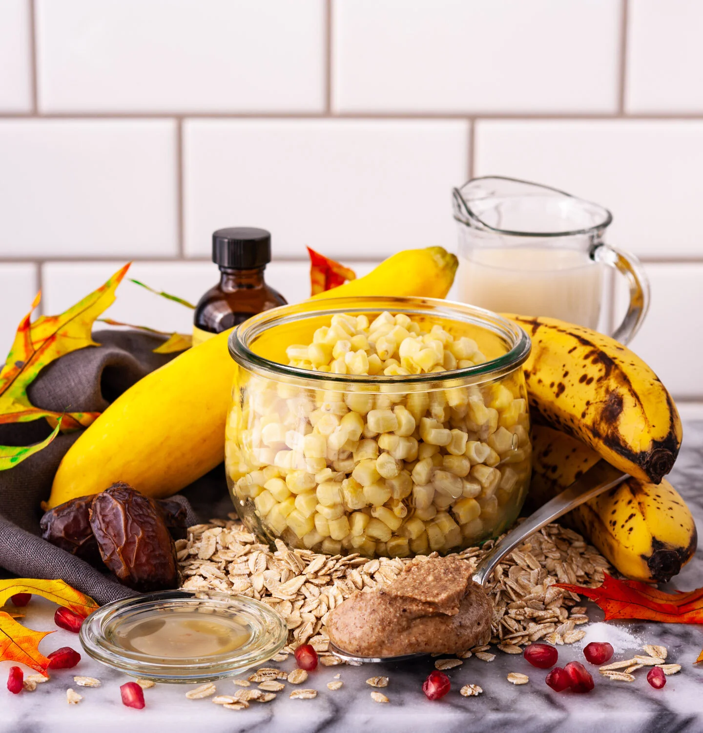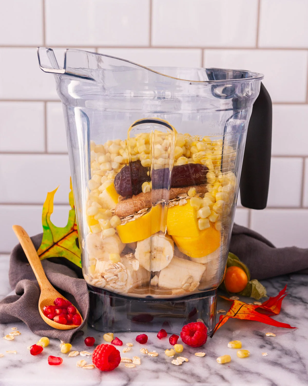 1. First, add the bananas and zucchini to a blender container, along with the almond milk, vanilla, apple cider vinegar, oats, and salt, followed by the almond butter, dates, and corn.