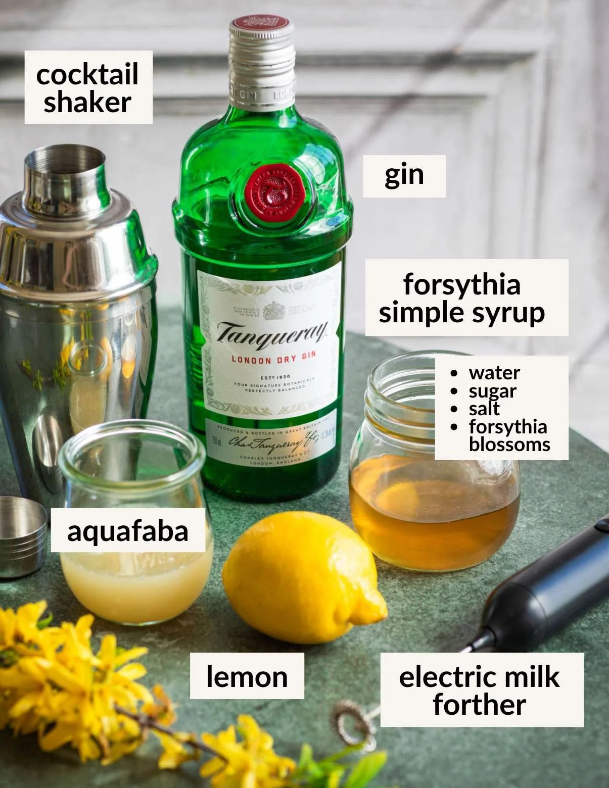 - Add the gin, aquafaba, lemon juice, and forsythia simple syrup to a dry cocktail shaker. (No ice yet!) Use an electric milk frother (best option) to wiz the liquid until light and frothy. Or vigorously dry shake until frothy.