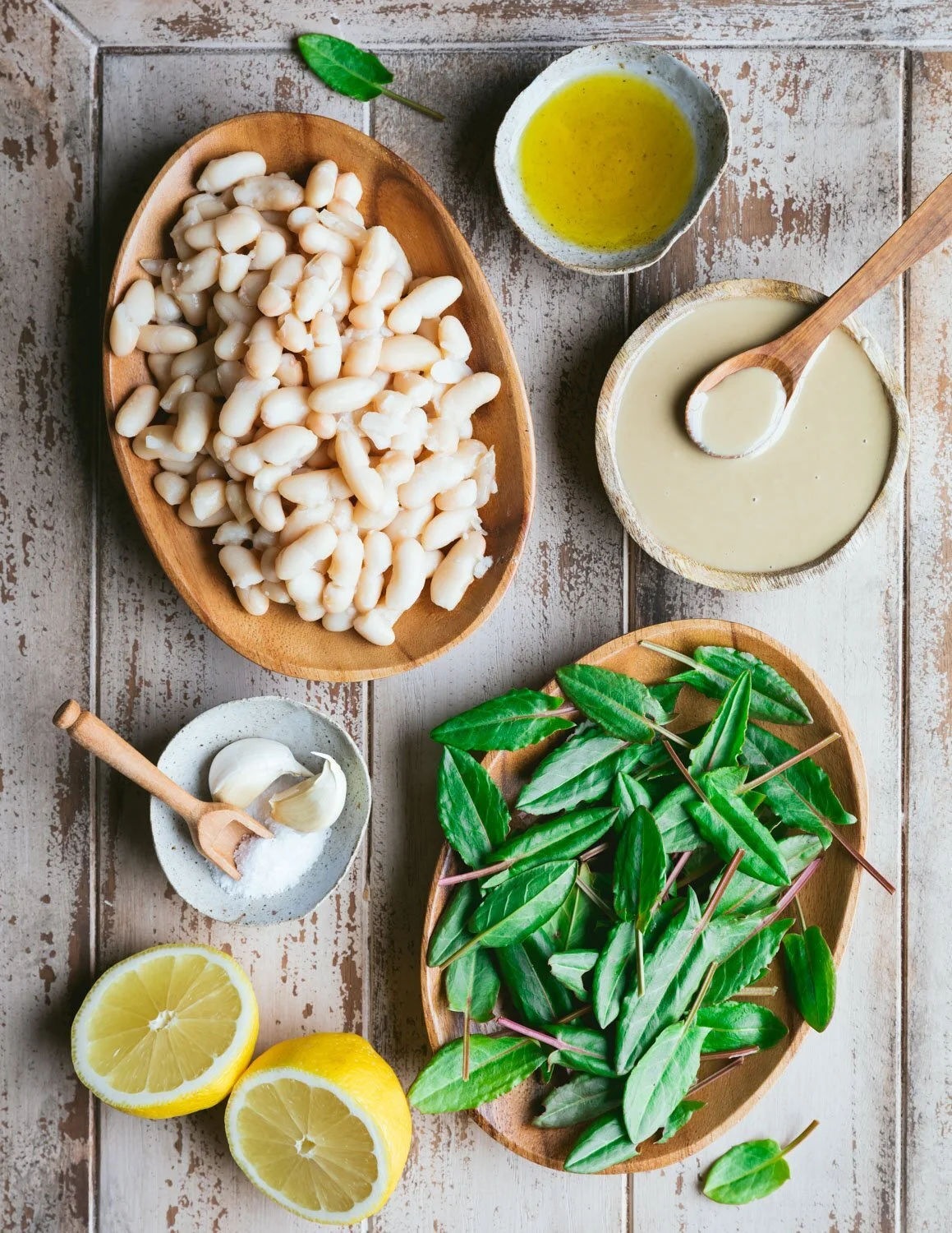 Ingredients for White Bean Sorrel Hummus / makes 2 cups